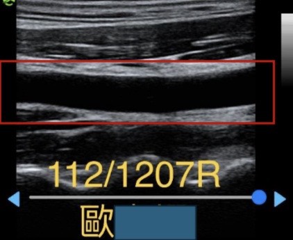 檢查發現,右側頸動脈有一斑塊栓塞嚴重(紅色框處),只剩1/5的血液能通過,導致供應腦部血液不足,腦部常處在缺氧狀態,引發胸悶、頭暈、精神不佳、嚴重失眠的狀況。